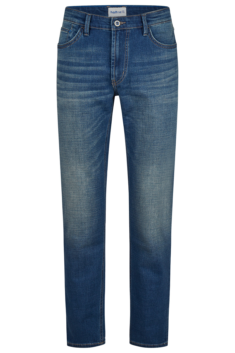 Die trendstarke hattric Jeans ist das ganze Jahr über ein perfekter modischer Begleiter und ungemein vielseitig. Sie sieht zu T-Shirt und Sneakers ebenso toll aus wie zu Sakko und Lederschuhen. Angefertigt aus Baumwolle, Polyester, Viskose sowie - für ein Extra an Tragekomfort und Bewegungsfreiheit - einem kleinen Anteil Elasthan, punktet sie mit Strapazierfähigkeit und einem kernigen Griff. Außerdem verfügt die Herrenhose über Einschubtaschen mit Coinpocket: Ein Merkmal, das bei Jeans auf keinen Fall fehlen darf! Selbstverständlich werden die Taschen durch die typischen Nieten verstärkt. De hattric Jeans kommt in der Passform Regular Fit daher und steht somit quasi jedem Mann.
