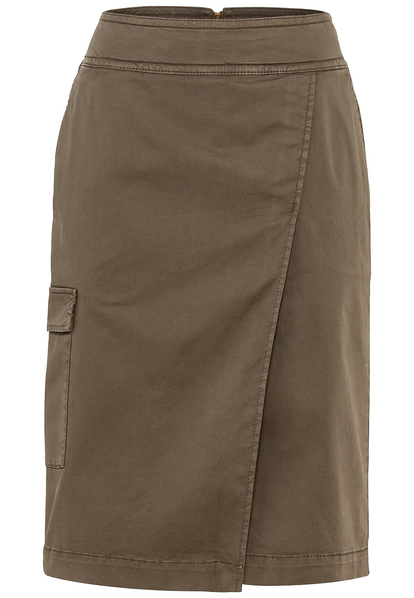 Dieser modische camel active Rock für Damen aus der aktuellen Frühjahr/Sommer-Kollektion von zeigt sich in einer attraktiven Wickeloptik. Ein leicht schräg verlaufender, langer Schlitz auf der Vorderseite ist ein Highlight bei dem Bleistift-Damenrock. Der komfortable und zugleich robuste Stoff besteht aus 97 % hautfreundlicher Baumwolle und 3 % Elasthan für den Stretch-Faktor. Durch eine Garment Dyed-Färbung entstehen bei dem camel active Rock authentische Wascheffekte für einen kernigen Look. An der linken Seite findest Du eine große, aufgesetzte Pattentasche mit charakteristischem C-Logo-Detail. Du kannst den Rock auf der Rückseite mit einem praktischen Reißverschluss schließen. Beachte bei diesem Damenrock unbedingt die Waschanleitung.