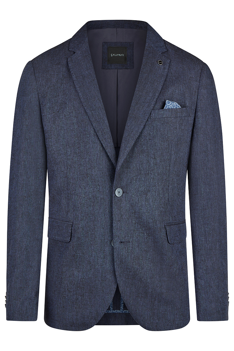Der Leinensakko Herringbone von CALAMAR bringt stilvolle Leichtigkeit in Deine Garderobe. Die feine Fischgrat-Struktur unterstreicht den hochwertigen Charakter und verleiht Deinem Look eine elegante Dynamik. Pattentaschen, Brusttasche und zwei Innentaschen bieten Dir funktionale Raffinesse, während die halbgefütterte Verarbeitung für angenehmen Tragekomfort sorgt. Seitliche Schlitze garantieren Bewegungsfreiheit und eine moderne Silhouette. Dieser Herren Leinenblazer ist die perfekte Wahl für sommerliche Business- und Smart-Casual-Outfits mit Anspruch.