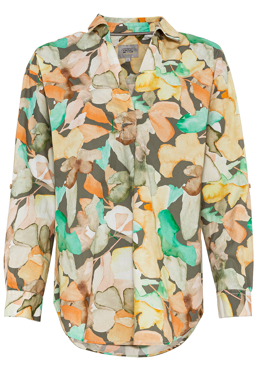 Mit der angesagten camel active Bluse aus der aktuellen Frühjahrs- und Sommerkollektion setzt Du gekonnt ein modisches Statement. Besonders der attraktive Allover-Print und der schicke Kentkragen mit V-Ausschnitt unterstreichen ihre hochwertige Verarbeitung und machen sie zu einer echten Trendsetterin für viele Outfits. Gleichzeitig stellt das dezente camel active Markenlabel am Saum einen süßen Blickfang dar. Kombinieren lässt sich die bezaubernde Damenbluse aus reiner Baumwolle entweder zur klassischen oder urbanen Garderobe. Indem Du ihre Ärmel lässig krempelst, kannst Du spontan ihren Style variieren und an Dein Outfit anpassen.