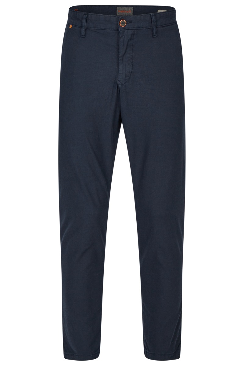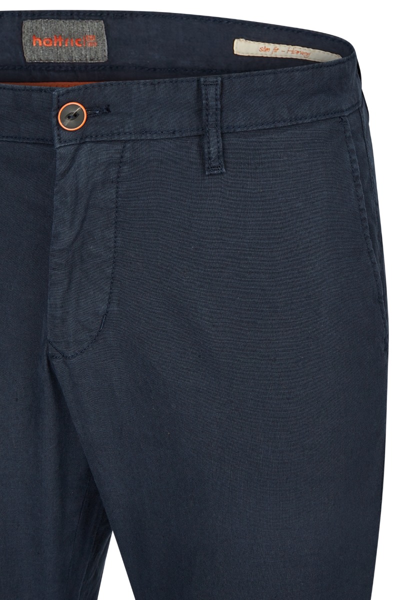 Die edle Leinenstruktur macht die Herrenchino so besonders. Die Materialmischung aus 53 % Leinen, 45 % Baumwolle und 2 % Elasthan fühlt sich angenehm auf der Haut an, nimmt Feuchtigkeit auf und erlaubt jede Bewegung durch die elastischen Fasern. Die hattric Chino ist schmal geschnitten und hat eine Fußweite von 36 cm. Optisch punktet die Herrenchino mit den französischen Eingriffstaschen und den rückwärtigen Leistentaschen, den Gürtelschlaufen und dem stilvollen Schnitt. Die Hose wird mit einem Reißverschluss und einem Metallknopf geschlossen.