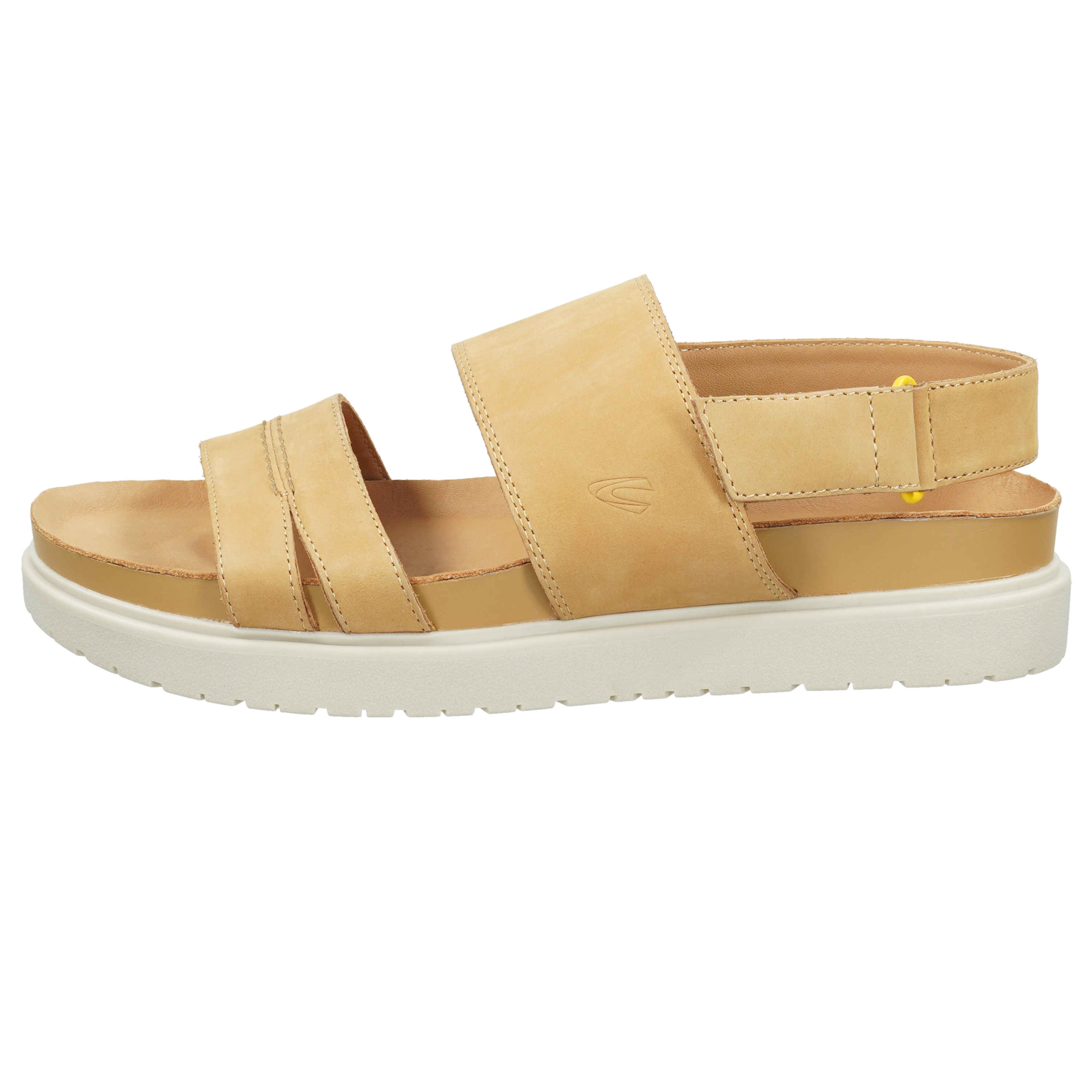 Sommerliche Sandale mit einem Obermaterial aus Nubuk mit einem Fersenriemen mit Klettverschluss. Die höhere EVA Sohle in weiß gibt dem Schuh einen sportlichen Touch und sorgt mit der Leder-Decksohle für einen angenehmen Tragekomfort - besonders beim Barfußtragen.