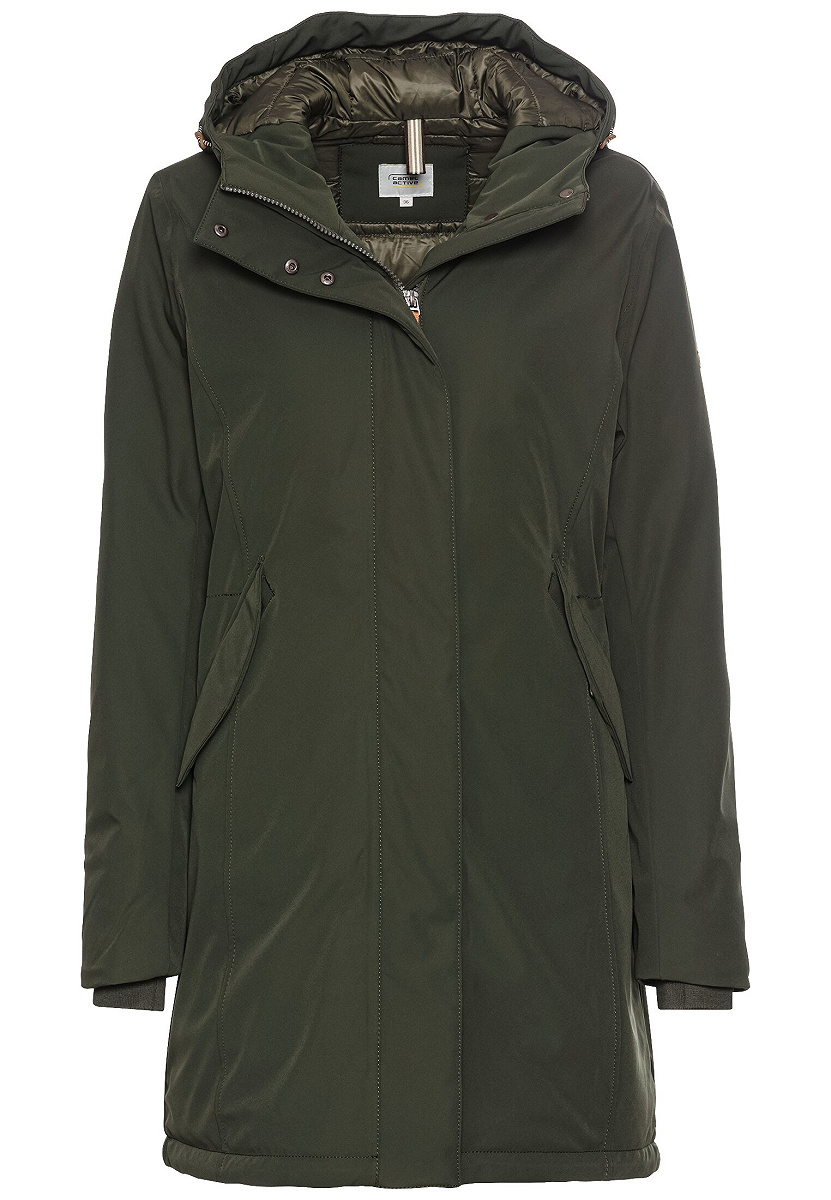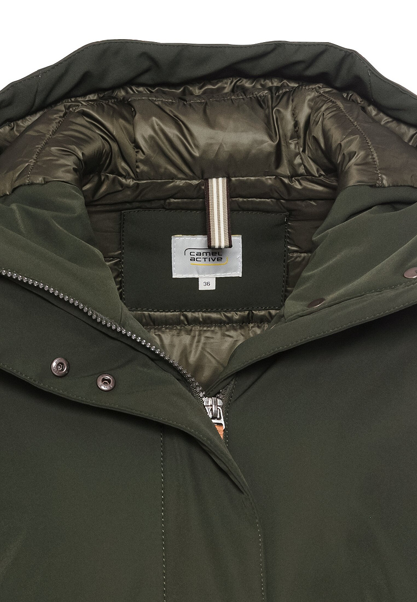 Damen-Funktionsmantel aus Polyamid/Polyester-Mix (43%/40%) mit Polyurethan- und Elasthananteil. Wasserabweisend, winddicht und daunenfrei, mit seitlichen Druckknopf-Taschen und Kapuze mit Tunnelzug. Das camel active Markenlogo auf dem linken Arm rundet den Outdoor-Style ab.