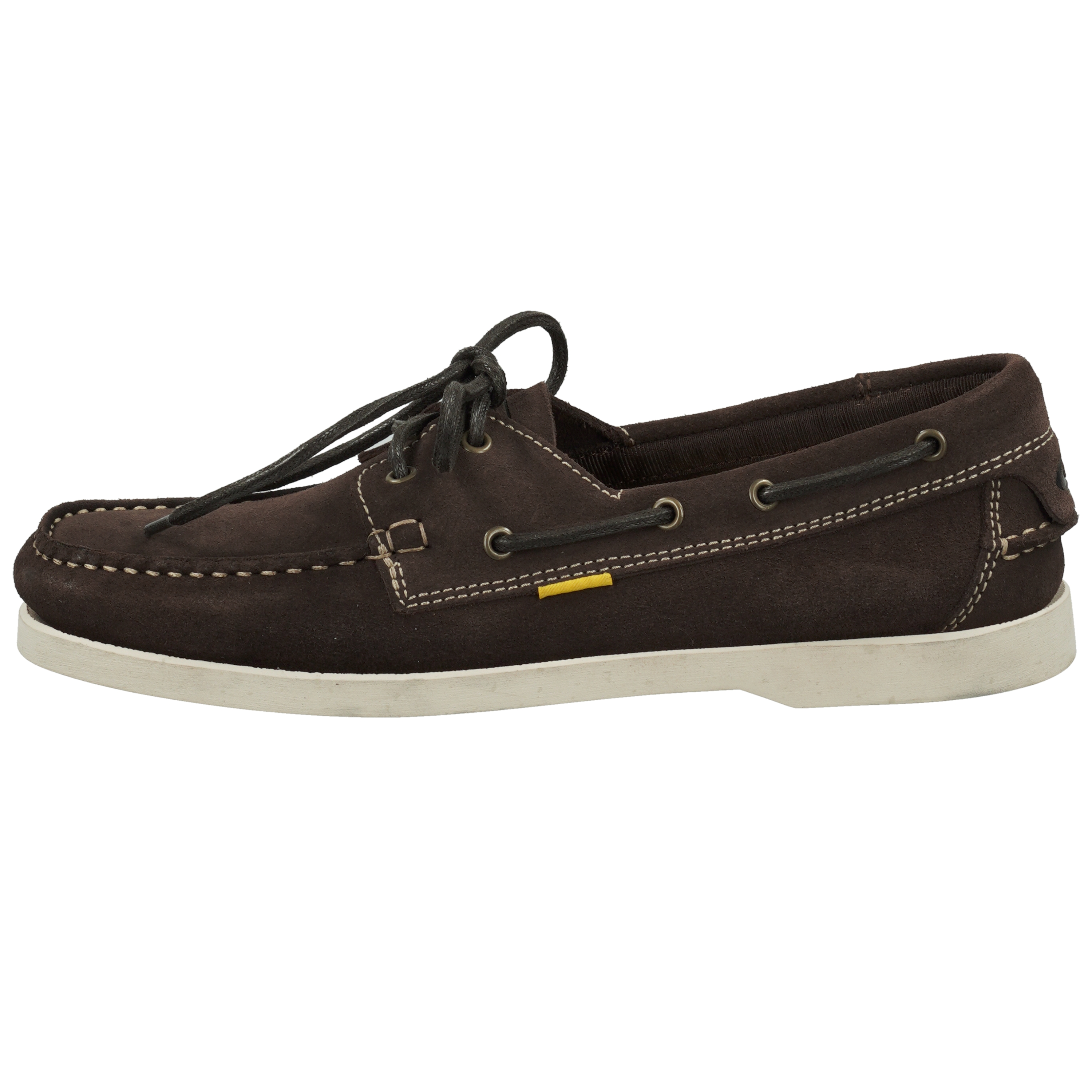 Klassischer Bootsschuh mit typischer 360-Grad Schnürung aus hochwertigem Veloursleder, Ziernähten und dezentem Branding über ein gelbes Fähnchen an der Außenseite des Schuhs. Die Decksohle ist aus Leder und hat einen Recovery Foam aus Recyclingmaterial. Mit einer weißen Gummiaußensohle ist der Schuh trittfest und rutschhemmend.