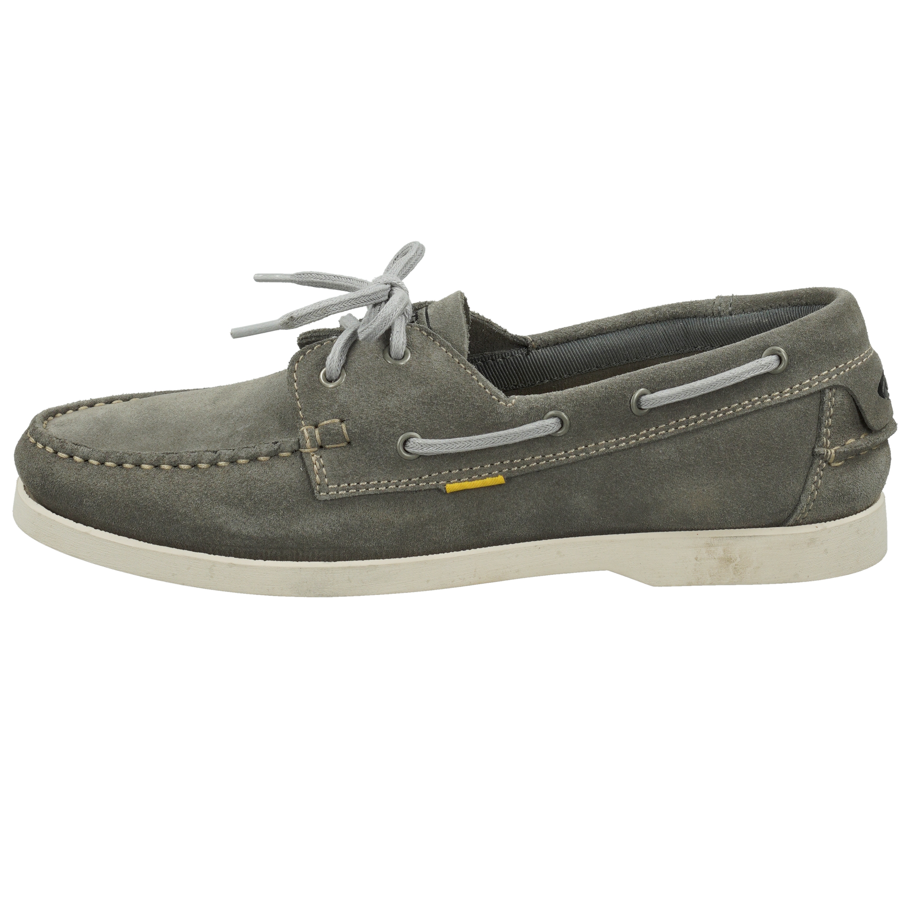 Klassischer Bootsschuh mit typischer 360-Grad Schnürung aus hochwertigem Veloursleder, Ziernähten und dezentem Branding über ein gelbes Fähnchen an der Außenseite des Schuhs. Die Decksohle ist aus Leder und hat einen Recovery Foam aus Recyclingmaterial. Mit einer weißen Gummiaußensohle ist der Schuh trittfest und rutschhemmend.
