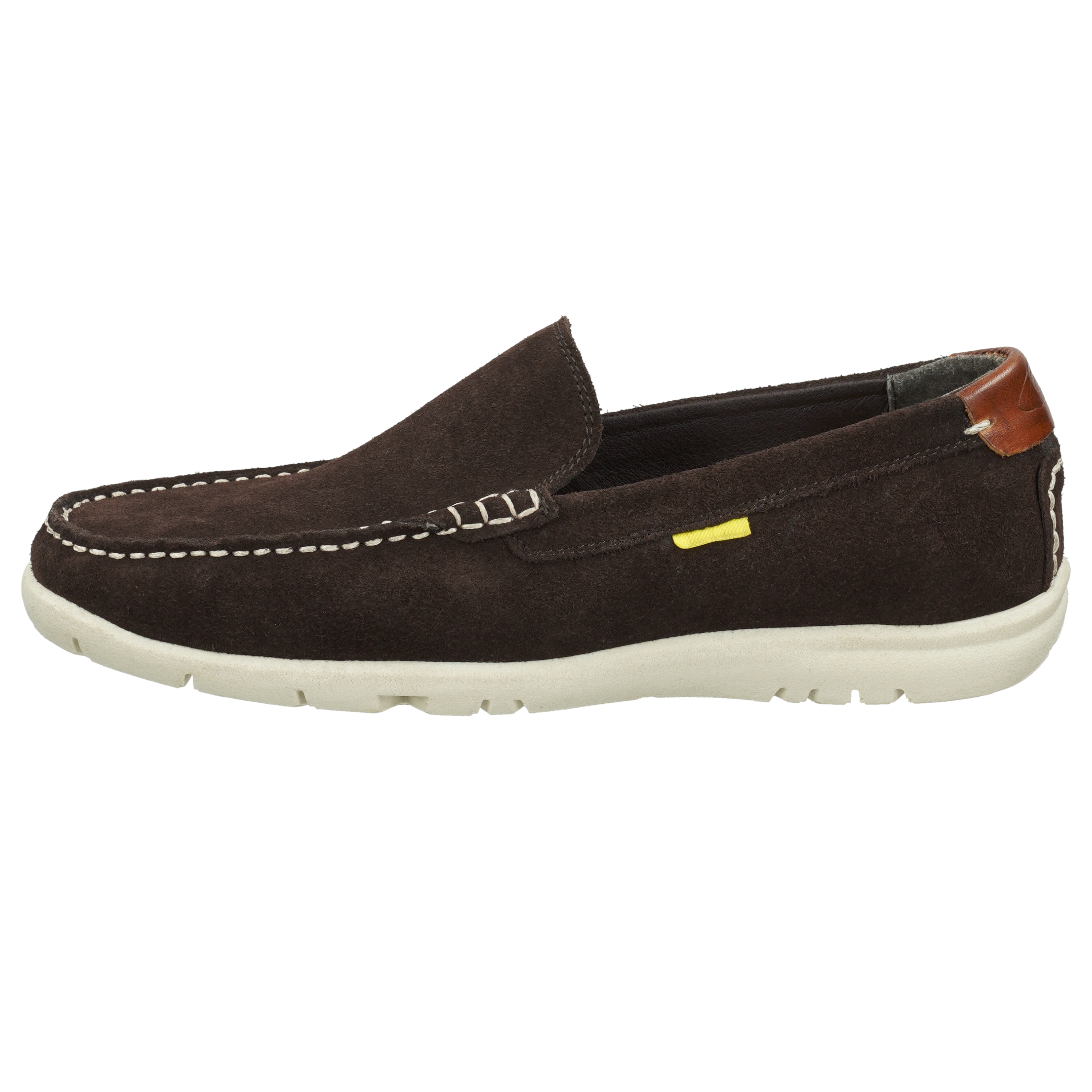 Klassischer Slipper für sommerliche Tage und einen Casual Look. Das Obermaterial ist aus hochwertigem Veloursleder mit Lederdetails im Fersenbereich, Ziernähten und dezentem Branding über ein gelbes Fähnchen an der Außenseite des Schuhs. Die Decksohle ist aus Textil. Mit einer weißen Gummiaußensohle ist der Schuh trittfest und rutschhemmend.