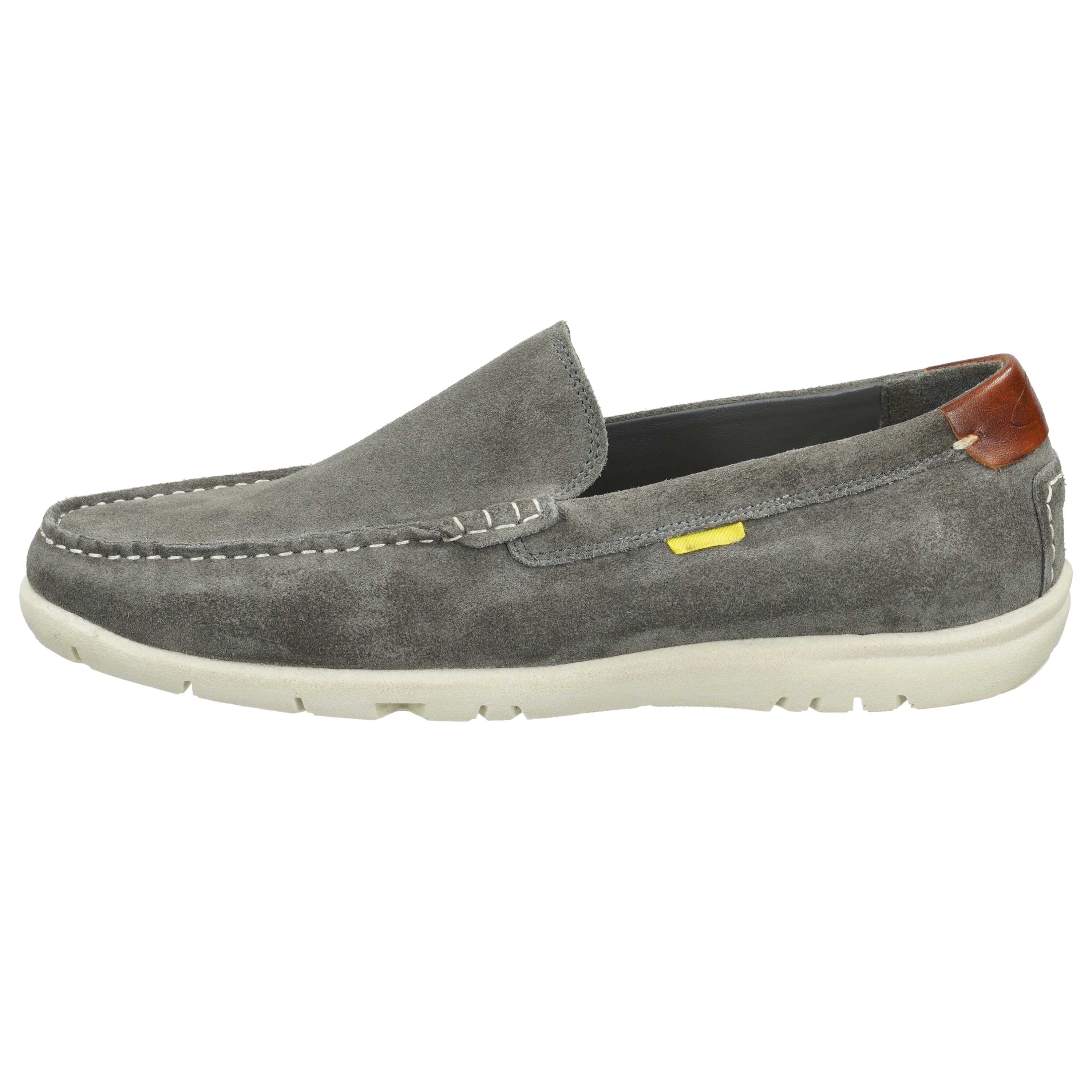 Klassischer Slipper für sommerliche Tage und einen Casual Look. Das Obermaterial ist aus hochwertigem Veloursleder mit Lederdetails im Fersenbereich, Ziernähten und dezentem Branding über ein gelbes Fähnchen an der Außenseite des Schuhs. Die Decksohle ist aus Textil. Mit einer weißen Gummiaußensohle ist der Schuh trittfest und rutschhemmend.