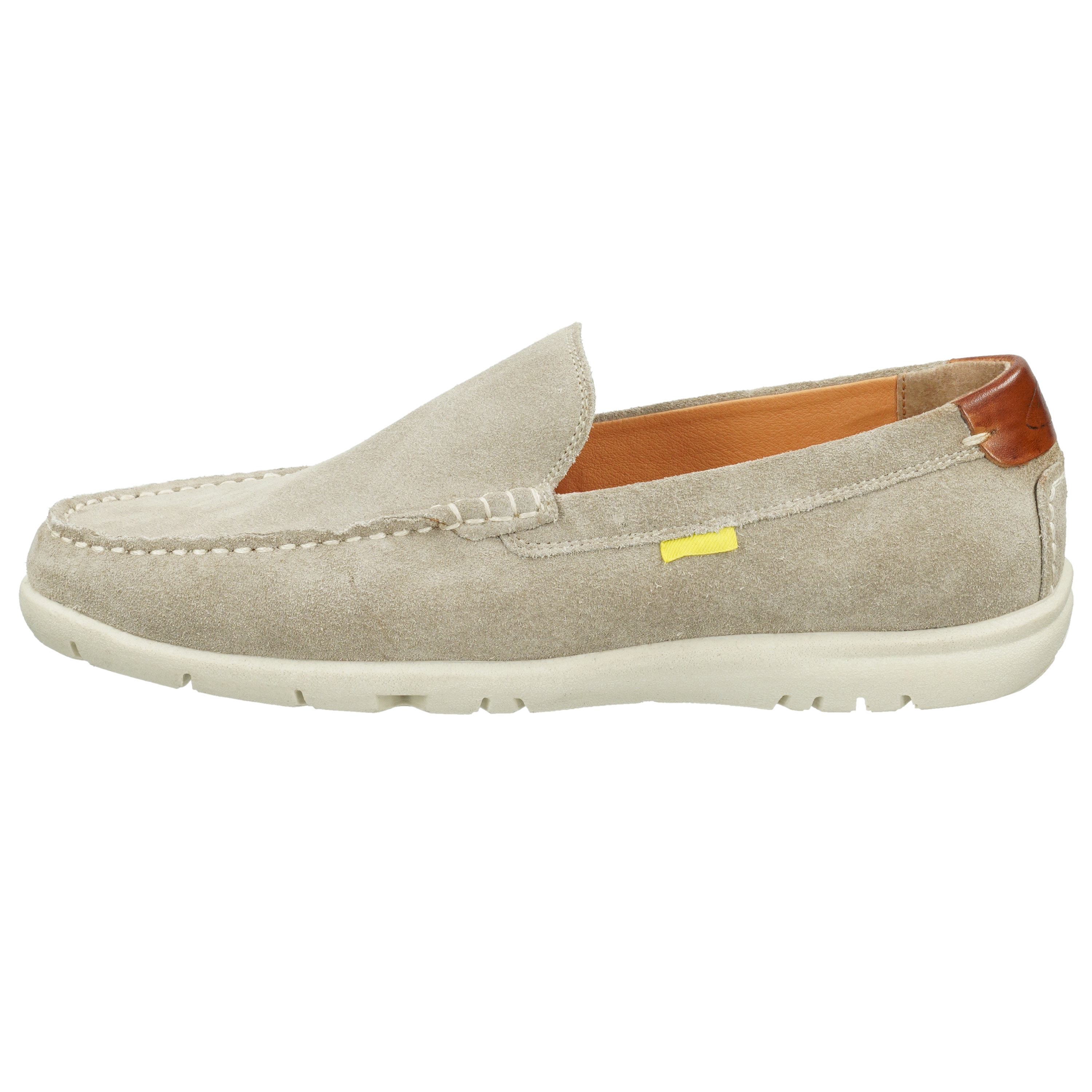 Klassischer Slipper für sommerliche Tage und einen Casual Look. Das Obermaterial ist aus hochwertigem Veloursleder mit Lederdetails im Fersenbereich, Ziernähten und dezentem Branding über ein gelbes Fähnchen an der Außenseite des Schuhs. Die Decksohle ist aus Textil. Mit einer weißen Gummiaußensohle ist der Schuh trittfest und rutschhemmend.