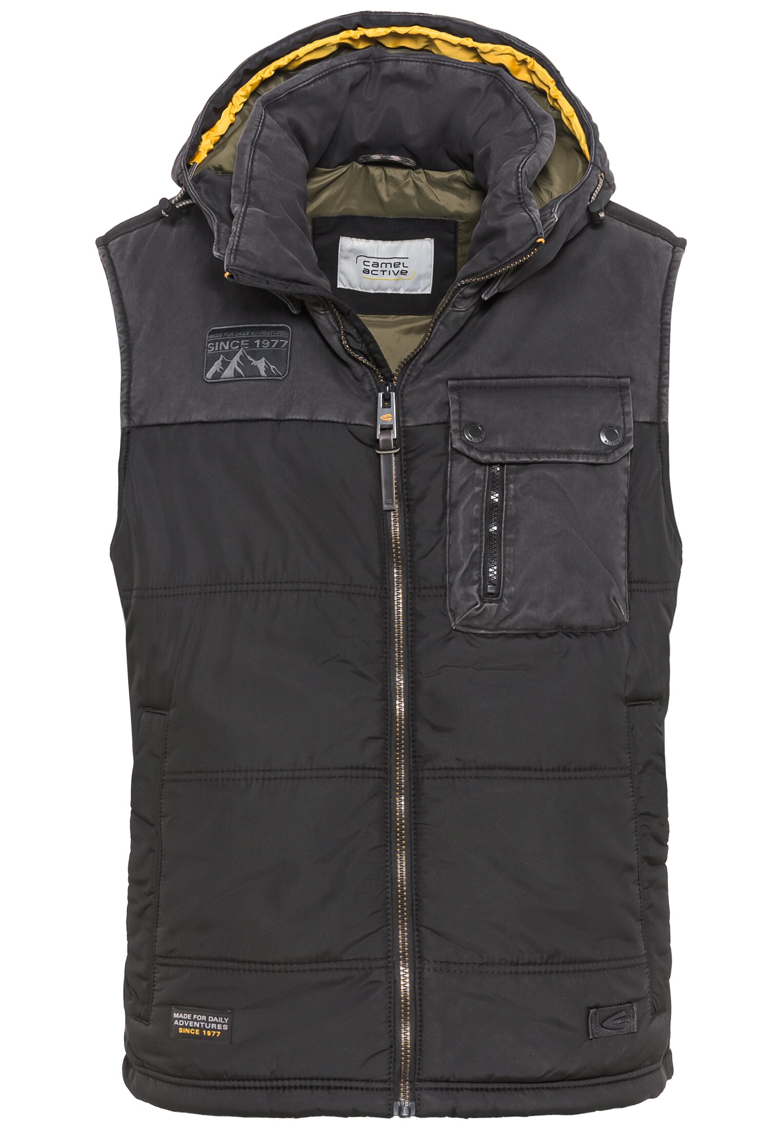 Die Outdoor Weste mit abnehmbarer Kapuze stammt aus der Herbst- und Winterkollektion. Die abnehmbare Kapuze ermöglicht es, den Look der Herrenweste individuell zu verändern. Das Futter der camel active Weste besteht aus reiner Baumwolle, der Oberstoff hingegen aus 100 Prozent Polyester. Die beiden seitlichen Taschen sind perfekt, um die Hände aufzuwärmen. Eine Brusttasche verschönert die camel active Jacke zudem optisch. Um wichtige Dinge zu verstauen, bieten sich die beiden Innentaschen an. Auf der linken Seite der Jacke befindet sich das camel active Markenlabel.