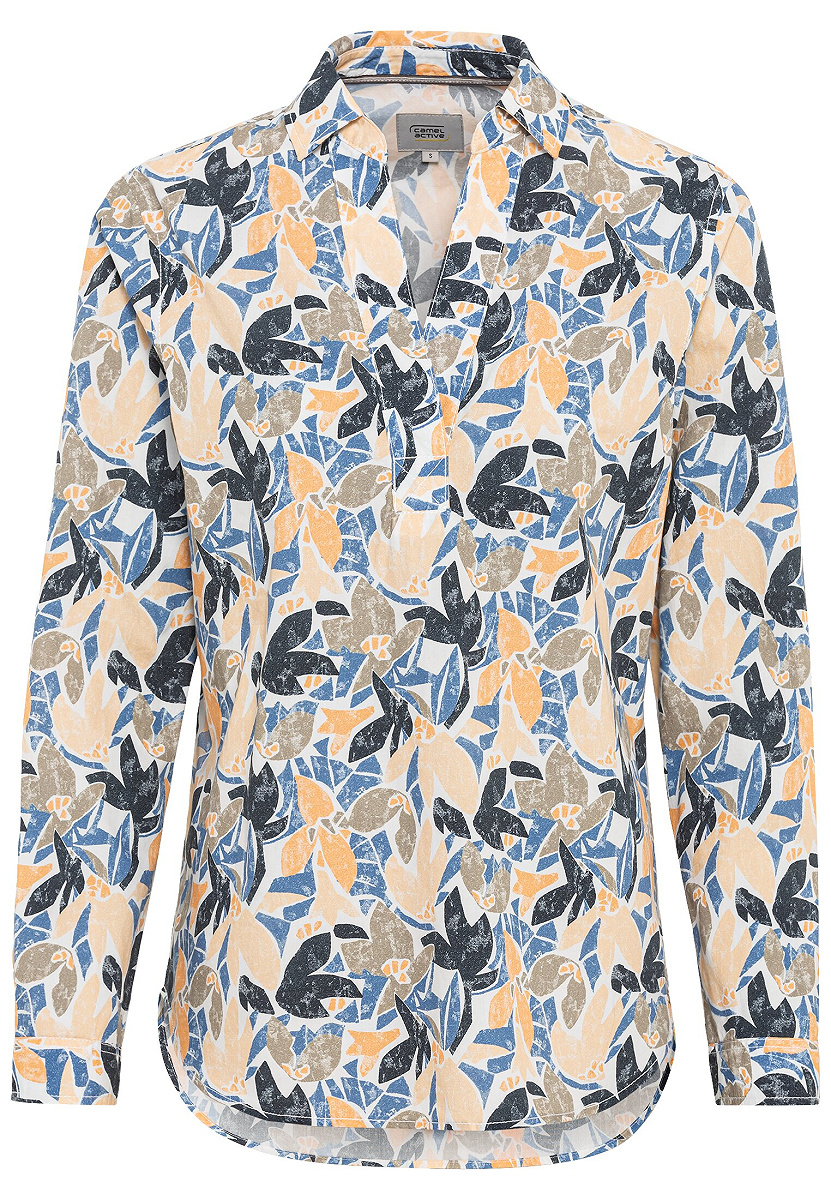 Mit dieser langärmeligen Schlupfbluse bringst Du frischen Wind in Deinen Kleiderschrank. Das auffällige Printdesign sorgt für einen echten Hingucker, während die reine Baumwolle Dir ein angenehm luftiges Tragegefühl schenkt – atmungsaktiv und pflegeleicht zugleich. Der lockere Regular Fit umspielt Deine Figur ganz entspannt und gibt Dir viel Bewegungsfreiheit. Der Hemdkragen mit Spatenausschnitt verleiht der Bluse einen besonderen Akzent, und die Manschetten an den Ärmeln runden den Look stilvoll ab. Ein kleines Detail zum Schluss: Am Saum findest Du das camel active Markenlabel aus Jacron – dezent, aber markant.