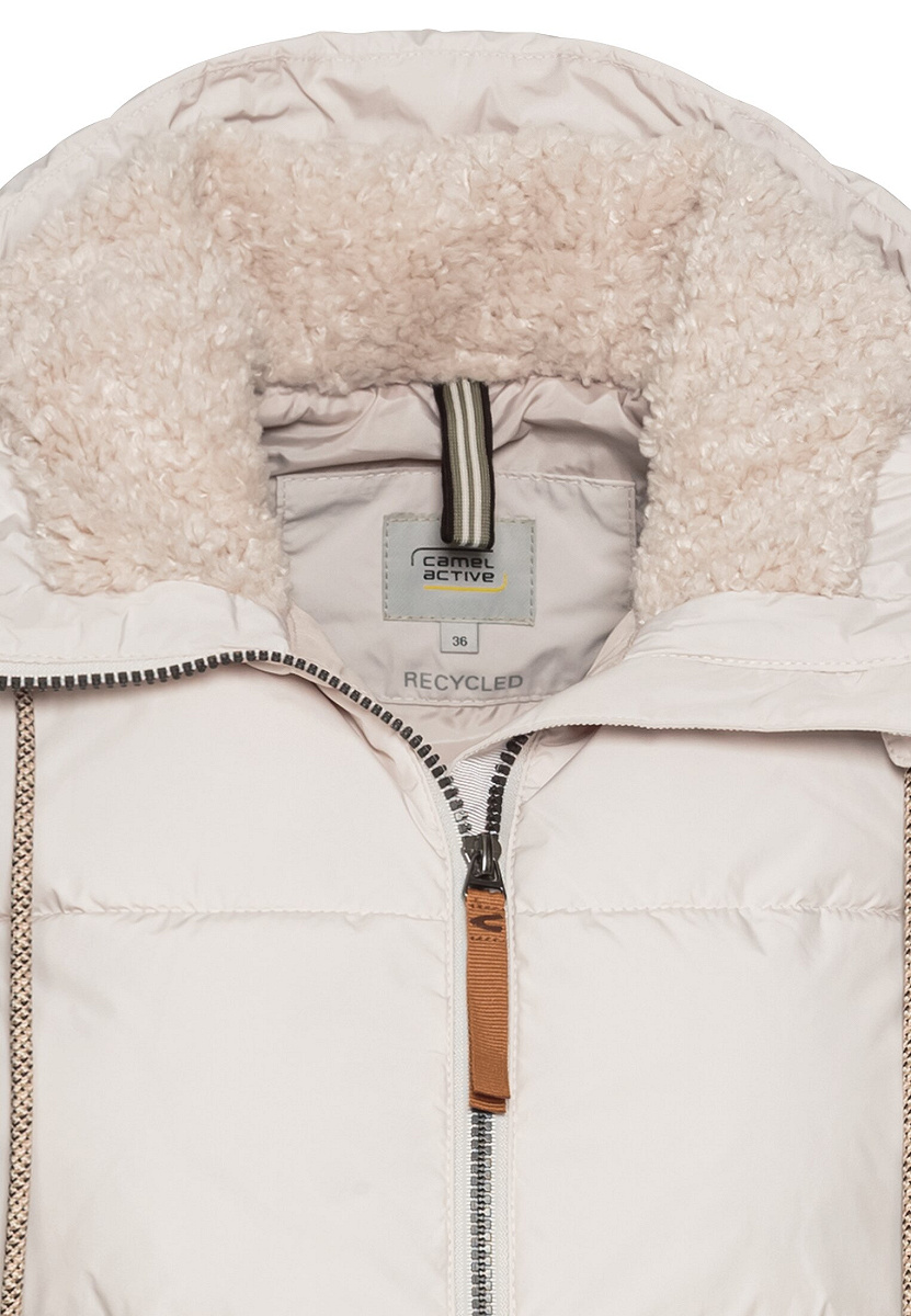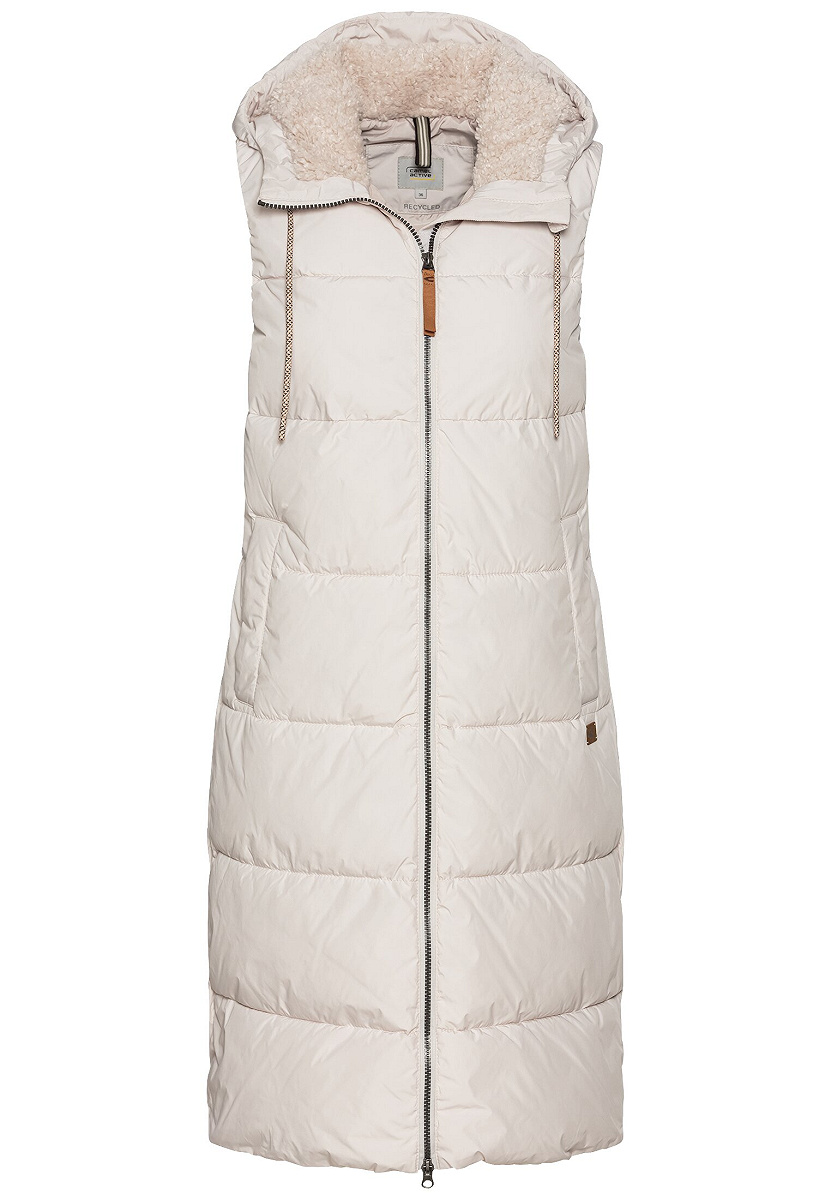 Lange Damen-Pufferweste aus Polyester, wasserabweisend, winddicht und daunenfrei. Mit plüschgefütterter Kapuze, 2-Wege-Reißverschluss und camel active Leder-Badge – perfekter Begleiter für kalte Tage.