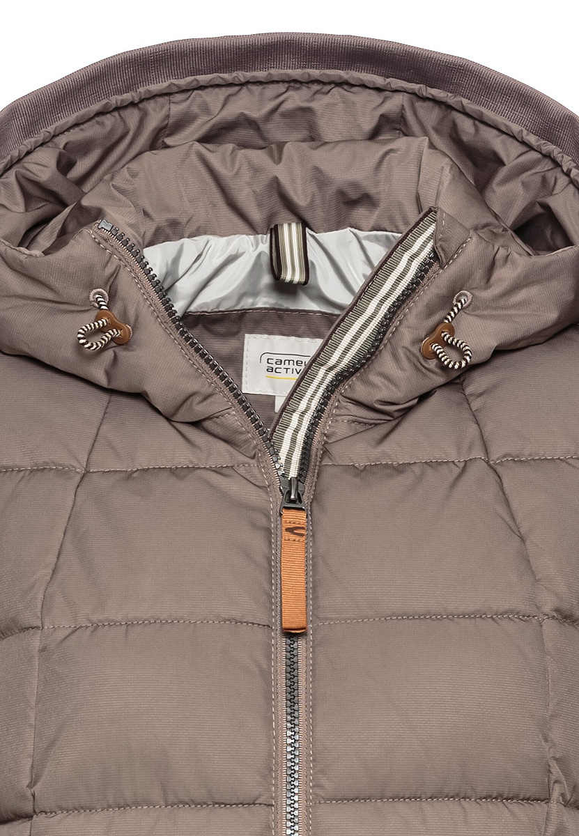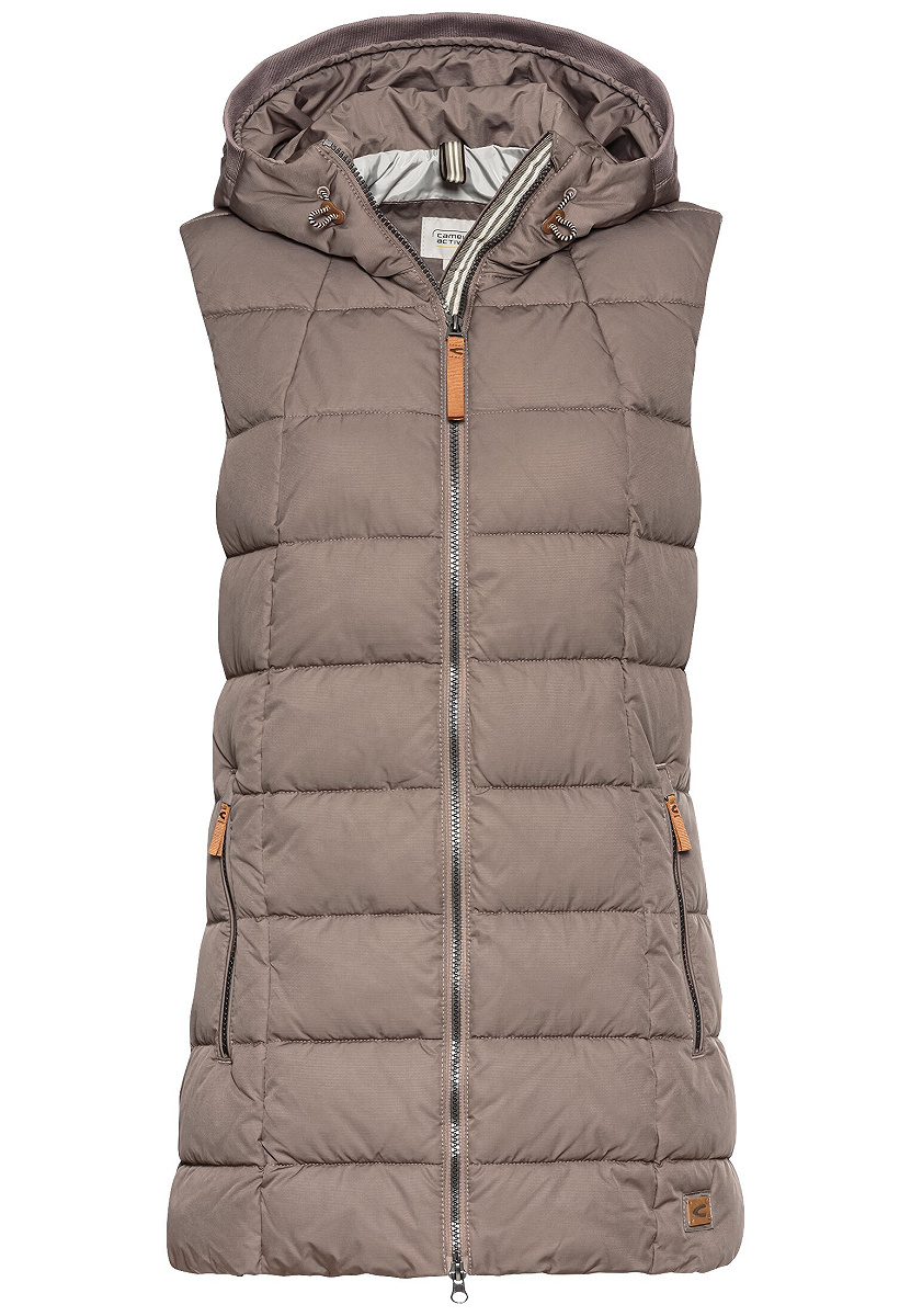 Lange Damenweste aus Polyester/Polyamid-Mix, wasserabweisend, winddicht und daunenfrei. Mit fester Kapuze mit Strickdetail, 2-Wege-Reißverschluss und camel active Markenlabel. Perfekt für Herbst- und Wintertage.
