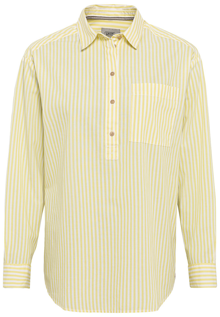 Diese Schlupfbluse aus reiner Baumwolle ist genau das Richtige für Dich, wenn Du einen lässigen, aber trotzdem stilvollen Look suchst. Der lockere Schnitt, der stark abgerundete Saum und die halblange Knopfleiste sorgen für eine entspannte Ausstrahlung – ideal, wenn Du es bequem, aber modisch magst. Dank Kentkragen, aufgesetzter Brusttasche und der Quetschfalte am Rücken bekommst Du zusätzlich eine schöne Silhouette mit etwas mehr Volumen. Und natürlich darf das camel active Markenlabel aus Jacron nicht fehlen – ein dezentes Detail mit Wiedererkennungswert.
