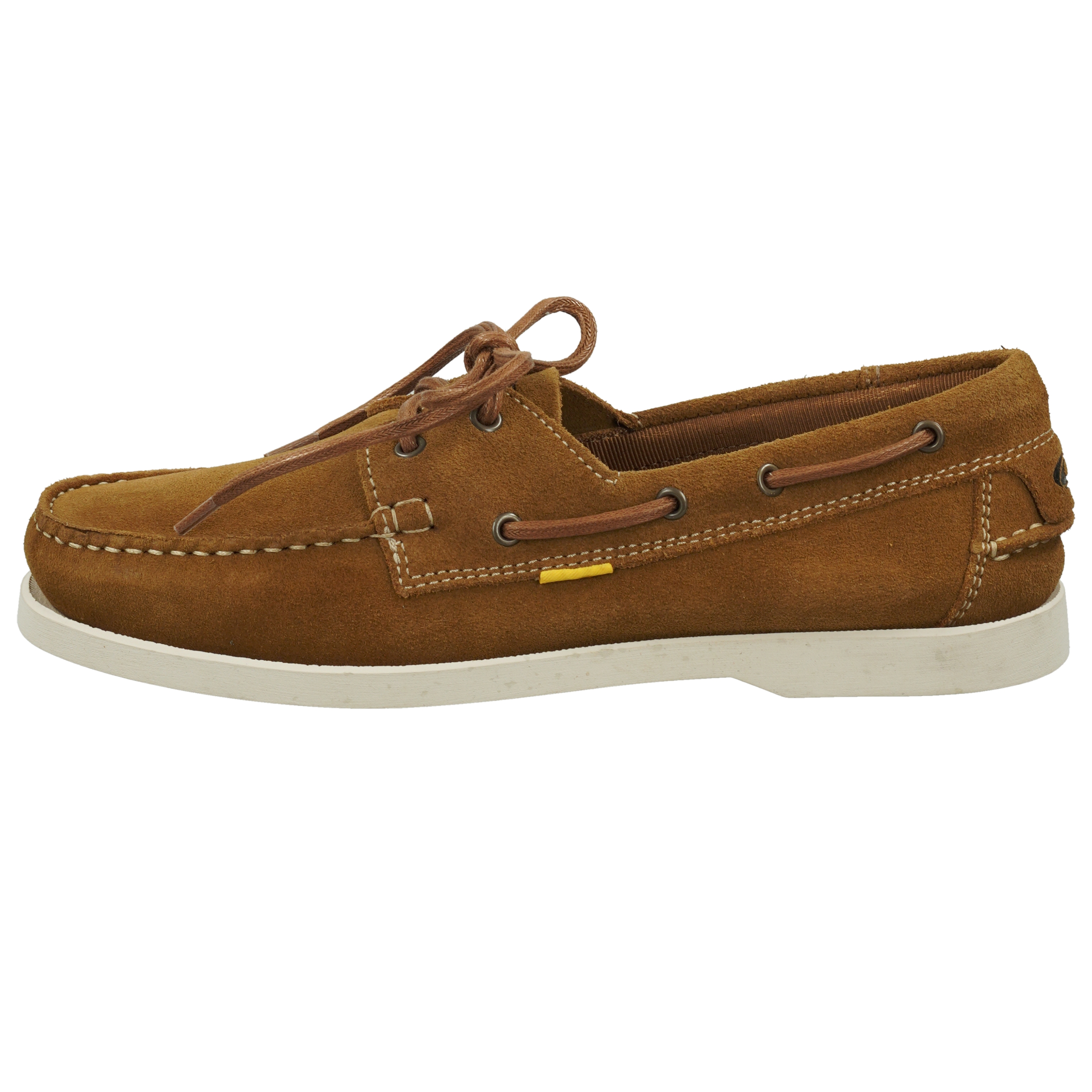 Klassischer Bootsschuh mit typischer 360-Grad Schnürung aus hochwertigem Veloursleder, Ziernähten und dezentem Branding über ein gelbes Fähnchen an der Außenseite des Schuhs. Die Decksohle ist aus Leder und hat einen Recovery Foam aus Recyclingmaterial. Mit einer weißen Gummiaußensohle ist der Schuh trittfest und rutschhemmend.
