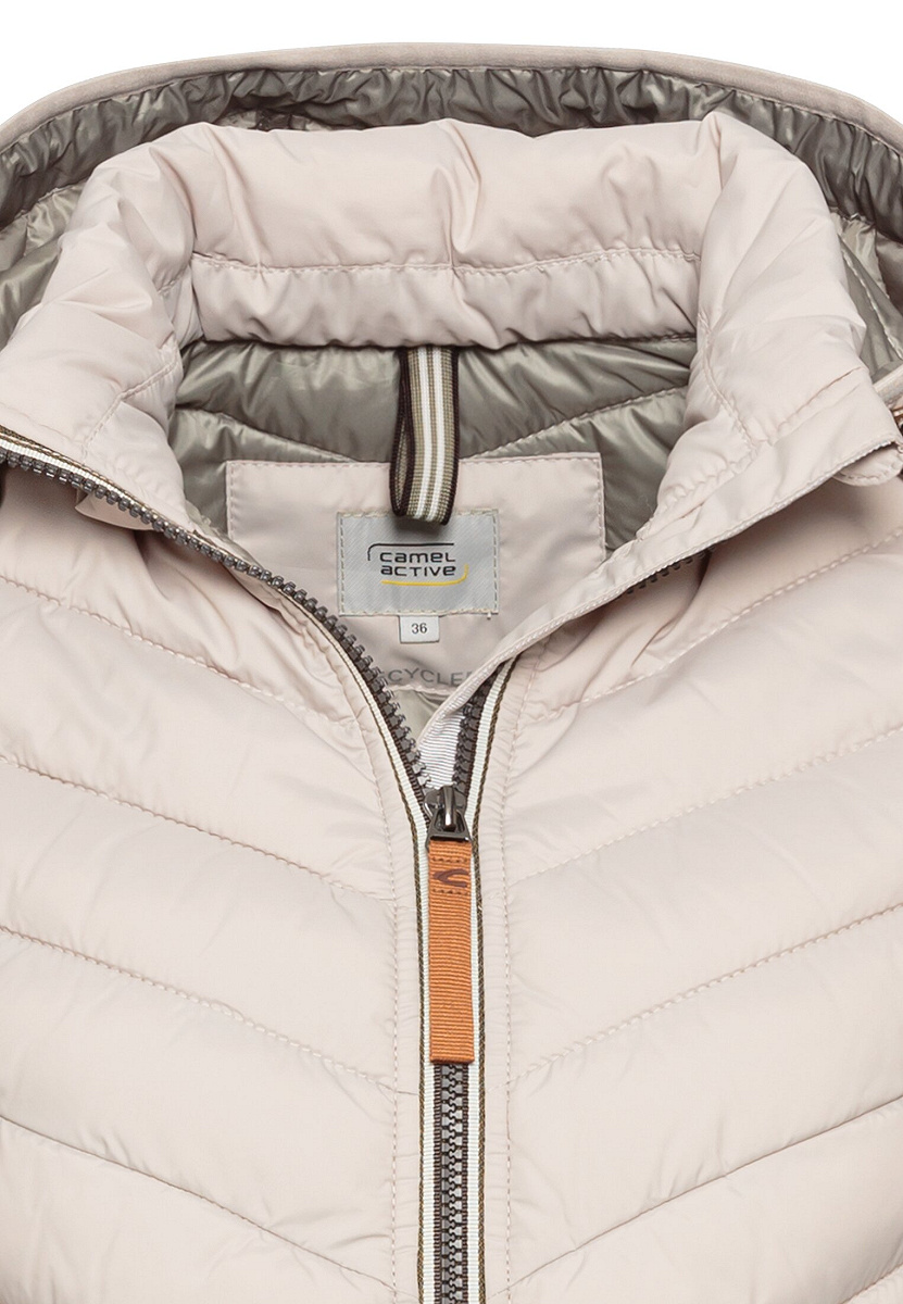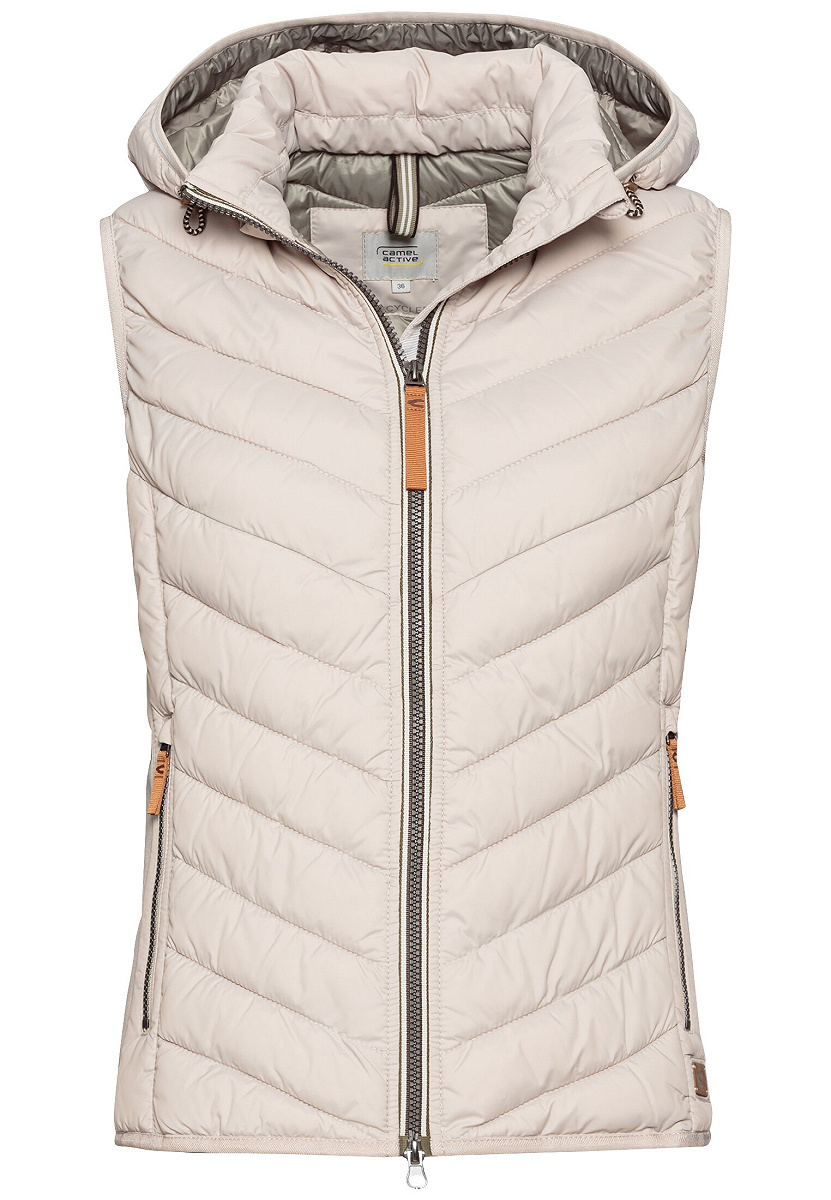 Damen-Steppweste aus recyceltem Polyester, wasserabweisend, winddicht und daunenfrei. Mit abnehmbarer Kapuze und camel active Markenlabel am Saum für funktionale Eleganz.