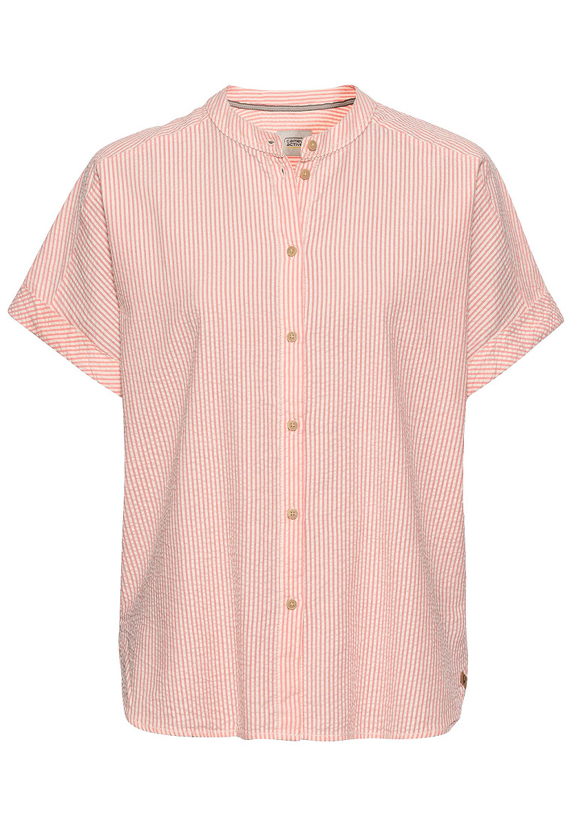 Diese Sommerbluse mit maritimen Streifen ist der ideale Blickfang für deinen Sommerlook. Die leichte Seersucker-Qualität sorgt für eine luftige Frische und verleiht der Bluse mit ihrer markanten Struktur das gewisse Etwas. Die reine Baumwolle garantiert dir besten Tragekomfort, da sie besonders atmungsaktiv ist und Feuchtigkeit optimal reguliert. Der schmale Stehkragen, die nahtlos angesetzten Krempelärmel und der seitlich stark abgerundete Saum sorgen für einen coolen, casual Look. Am Saum findest du zudem das camel active Markenlabel, das das Design perfekt abrundet. Ein echtes Highlight für die warme Jahreszeit!