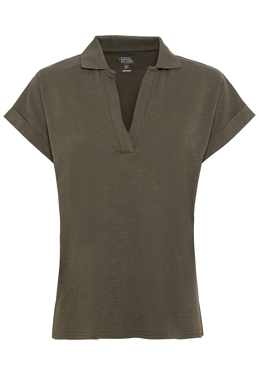 Dieses knopflose camel active Poloshirt für Damen ist aus der aktuellen Kollektion für das Frühjahr und den Sommer. Anstatt Knöpfen, besitzt das Damen-Poloshirt einen klassischen Polokragen mit Schlitz, der an einen spitz zulaufenden V-Ausschnitt erinnert. Der Stoff in wertvoller Slubjersey-Qualität wird aus reiner Bio-Baumwolle hergestellt: Diese ist gut für unsere Umwelt und zugleich angenehm auf Deiner Haut. Die überschnittenen Ärmel mit umgeschlagenem Saum komplettieren das modische Design des camel active Poloshirts. Du hast dank der locker sitzenden Passform in Regular Fit in dem Shirt ausreichend Bewegungsfreiheit. Das Damen-Poloshirt ist am unteren Saum mit einem typischen C-Logo-Detail des Labels versehen.