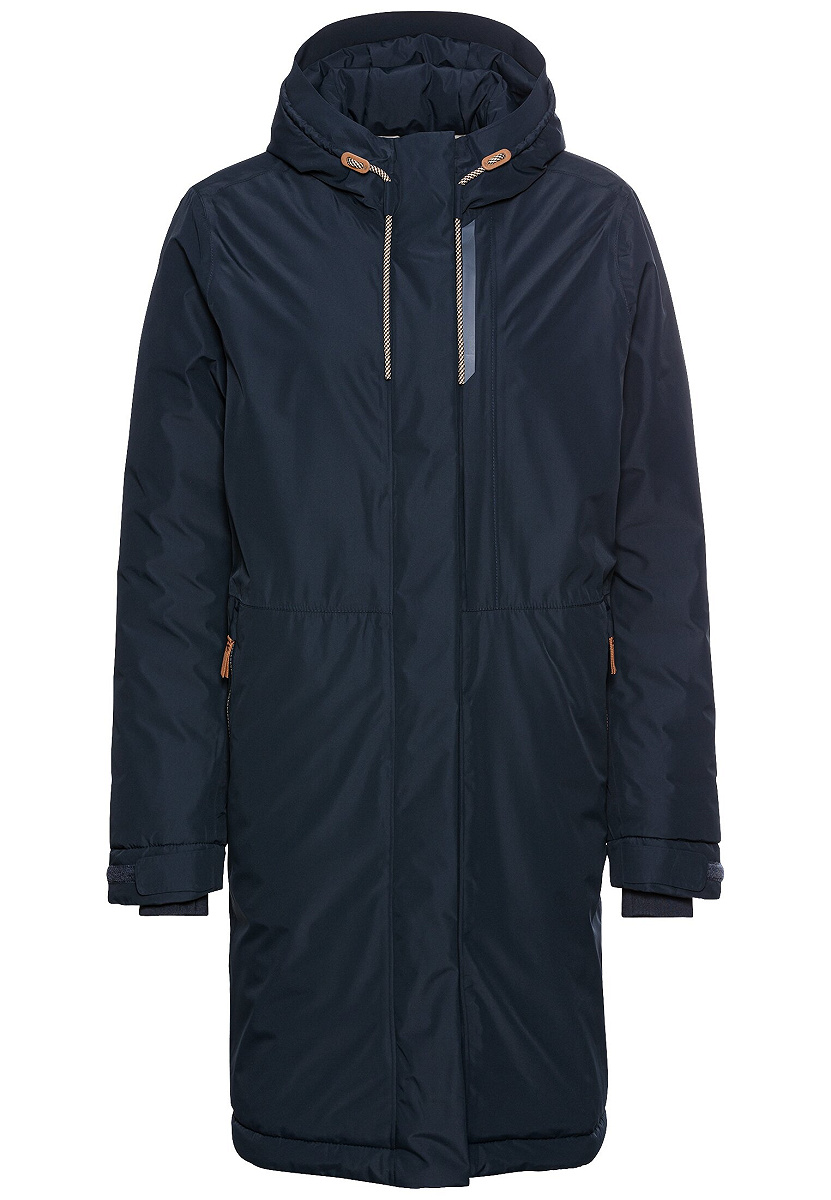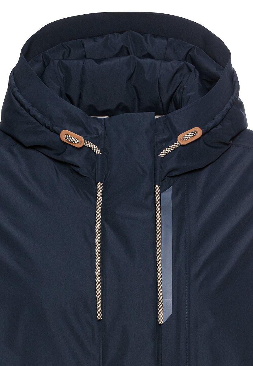 Nachhaltiger, wasserdichter Damenmantel mit teXXXactive® Technologie aus GRS-zertifiziertem Polyester. Winddicht, atmungsaktiv, mit reflektierenden Drucken und camel active Markenlogo auf dem linken Arm – perfekt für Outdoor und City.